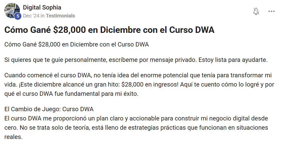 Tendrás acceso al grupo privado de Telegram de DWA donde puedes hacer todas tus preguntas, incluso en la plataforma tienes acceso a esto.